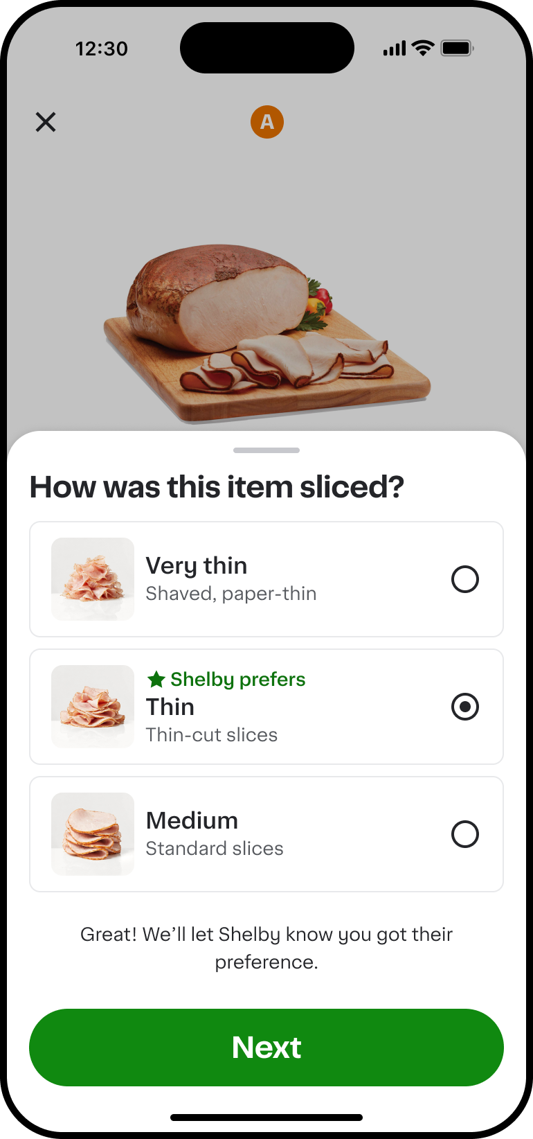 When a customer orders custom sliced deli meat, you'll see their preferred slice thickness, if specified, right in the app—whether they want it shaved “Very thin”, sliced “Thin”, or cut “Medium”. You can let the store’s deli counter know the preferred slice thickness when requesting your customer’s custom sliced meat.