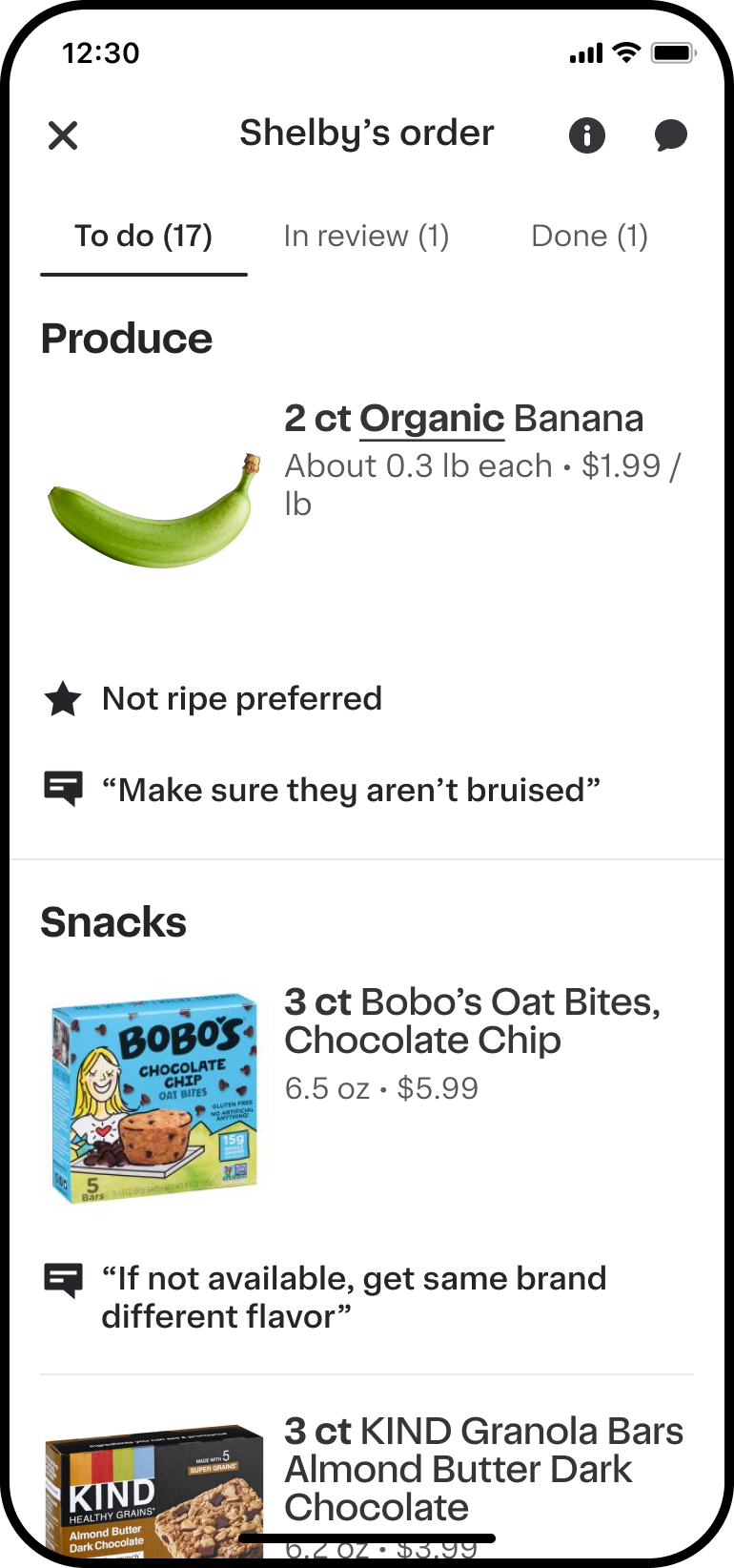 If the exact preference isn’t available in-store, pick the closest match and indicate what you found in-app. Then, take a photo of what items you picked. We’ll automatically share what you found and the photo with the customer in chat so they can stay informed and you can focus on shopping.