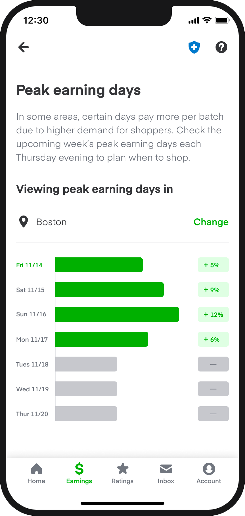 The peak earnings day page can help you plan your shopping up to a week in advance. The chart shows how base batch pay will now adjust across the week based on projected customer demand in your area. Each week, we’ll provide you with the details of which days pay more per batch compared to the lowest paying day that week, so you can shop on the days that work best for you.