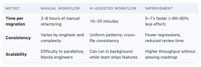 AI excels at repetitive, mechanical refactoring. The 5–7x speed increase we observed in Phase 2 saved an estimated 300–350 engineering hours and made migrations feasible that were previously too tedious to justify.