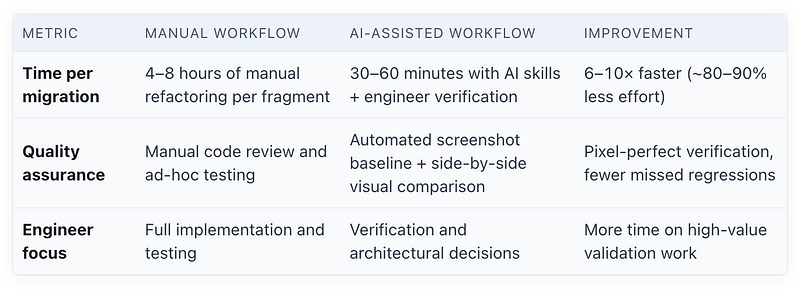 • Migration time varies by fragment complexity, but the AI workflow dramatically reduces the long tail.